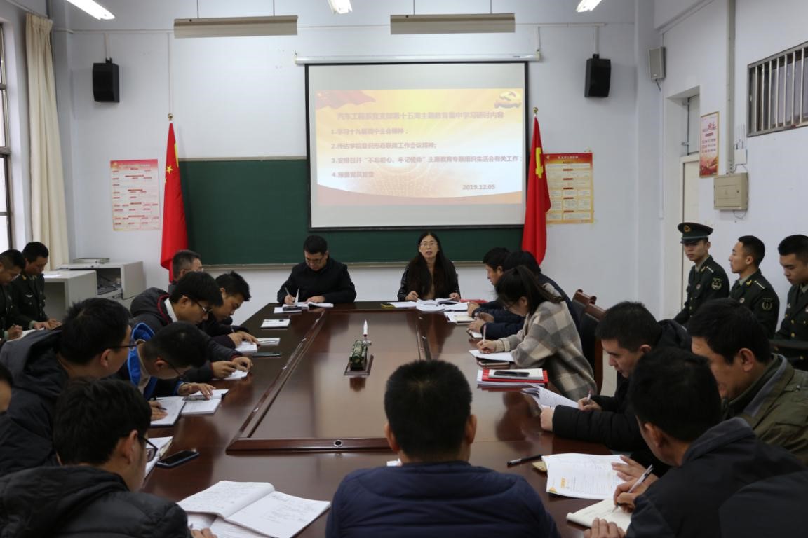 12月05日下午1:30,汽车工程系党支部在4302会议室组织开展党员集体政治学习。本次学习内容为四个方面:一是学习十九届四中全会精神;二是学习学院意识形态联席工作会议精神;三是安排召开“不忘初心、牢记使命”主题教育专题组织生活会有关工作;四是预备党员宣誓。