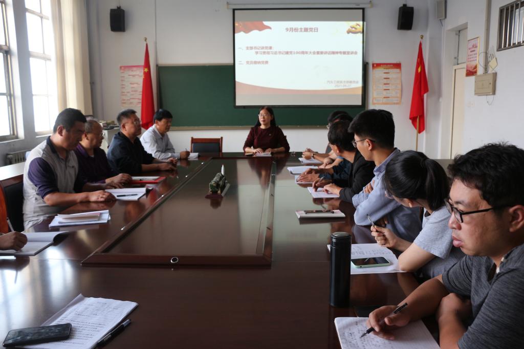 9月27日下午,汽车工程系支部委员会组织全体党员教师在4302会议室组织开展“弘扬建党精神 凝聚奋进力量”主题党日活动。活动中,党支部书记李旭兰为全体党员讲党课,对习近平总书记建党100周年大会重要讲话精神进行了专题宣讲。