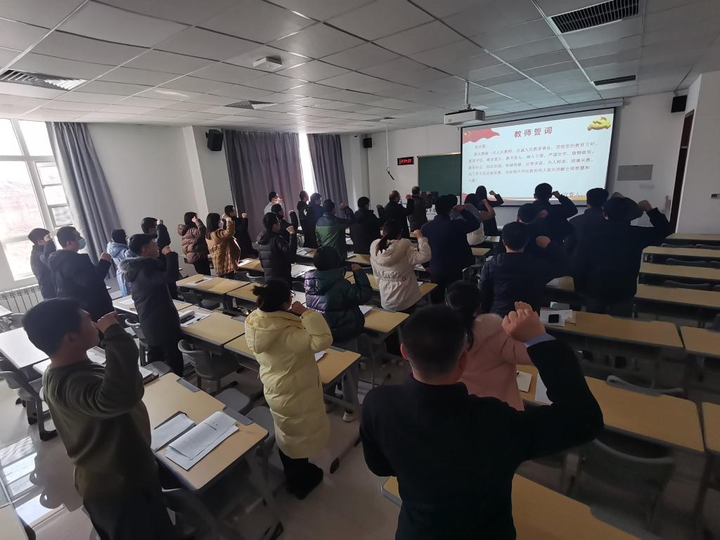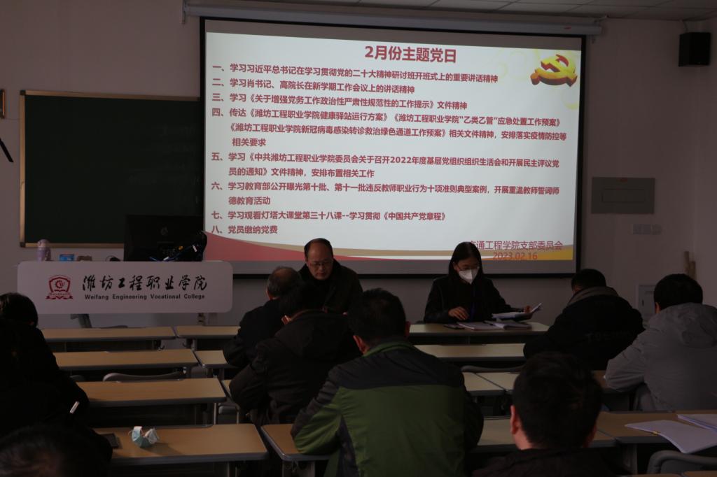 2月16日下午,交通工程学院支部委员会组织开展“重温教师誓词 牢记初心使命”主题党日活动。活动中,大家学习了习近平总书记在学习贯彻党的二十大精神研讨班开班式上的重要讲话精神、肖书记、高院长在新学期工作会议上的讲话精神相关内容。并传达学习了《关于增强党务工作政治性严肃性规范性的工作提示》、《潍坊工程职业学院健康驿站运行方案》、《潍坊工程职业学院“乙类乙管”应急处置工作预案》、《潍坊工程职业学院新冠病毒感染转诊救治绿色通道工作预案》、《中共潍坊工程职业学院委员会关于召开2022年度基层党组织组织生活会和开展民主评议党员的通知》相关文件精神,安排落实相关工作。