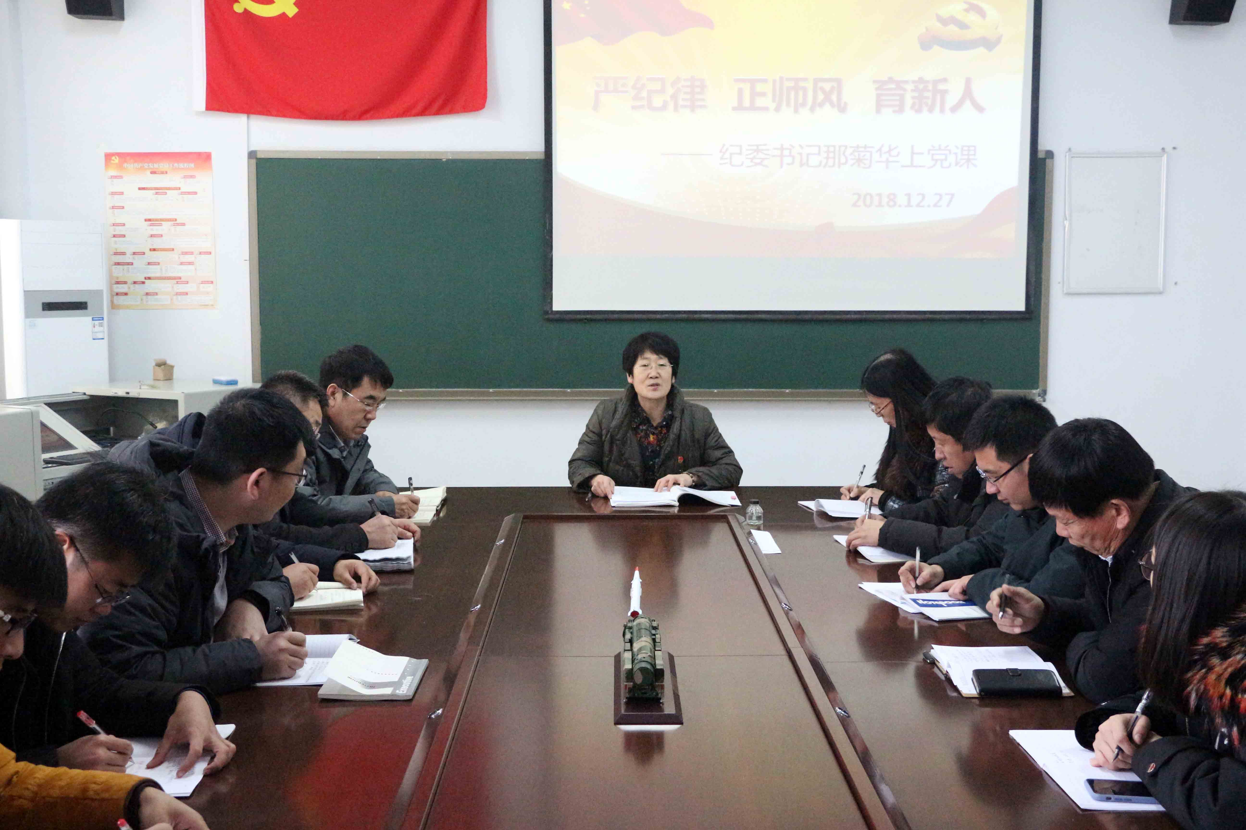 12月27日下午,纪委书记那菊华来到汽车工程系党支部,为全体党员作了一堂“严纪律、正师风、育新人”的专题党课。