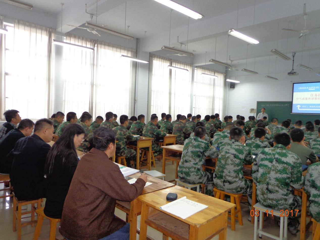 本节课为《柴油机电控技术》空气流量传感器的认识与检测,授课对象为16级汽车检测与维修技术(火箭军、陆军)士官班,聂老师结合部队装备的实际以及多年的工作经验,从空气流量传感器类型、结构特点、工作过程、检修四个方面对本节课进行讲解。同时在讲课过程中,综合运用视频展示、原理图动画演示、图片讲解等多种教学方法对本节课进行了深入浅出的讲解。整堂课互动效果好,课堂学习氛围浓厚,士官班学生对复杂的传感器工作原理以及检修方法有了很好的掌握。