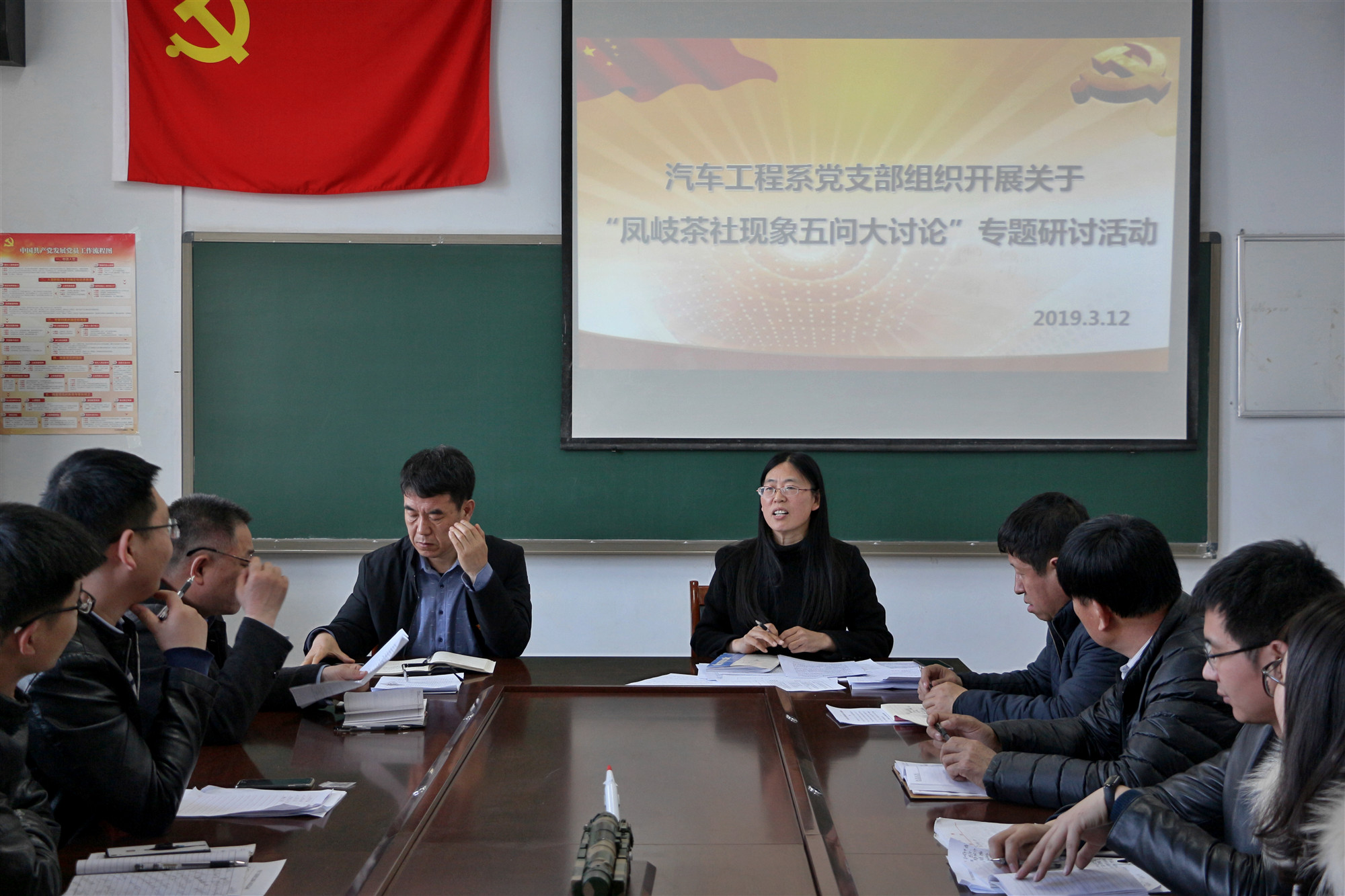 2019年3月12日下午4:00,汽车工程系党支部在4302会议室组织全体教师开展“凤岐茶社现象五问大讨论”活动。