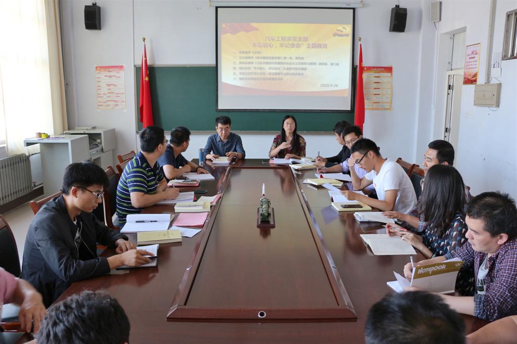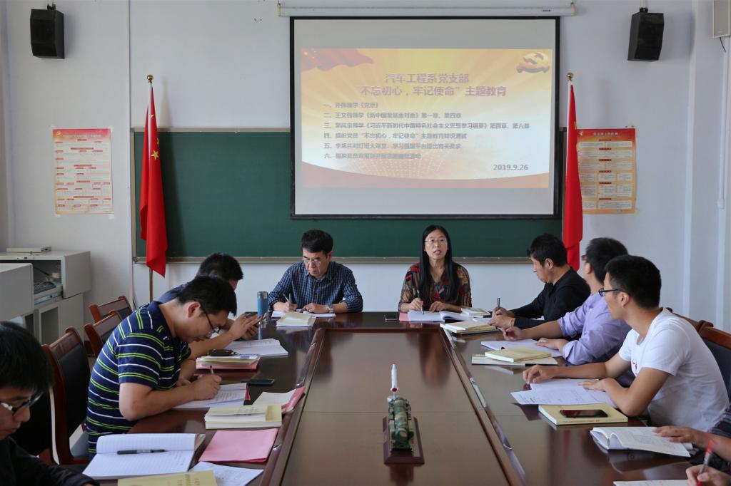 9月26日下午1:00,汽车工程系党支部在4302会议室组织开展第五周党员集体政治学习,学习内容为六个方面。一是孙伟领学《中国共产党章程》;二是王文强领学《新中国发展面对面》第一章、第四章;三是郭风泉领学《习近平新时代中国特色社会主义思想学习纲要》第四章、第六章;四是组织党员进行“不忘初心、牢记使命”主题教育知识测试;五是李旭兰对灯塔大课堂、学习强国平台提出有关要求;六是组织党员双报到开展志愿服务活动。