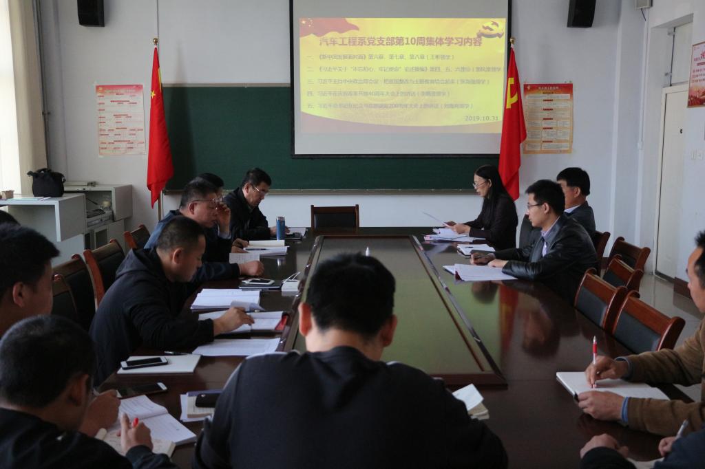 10月31日下午1:30,汽车工程系党支部在4302会议室组织开展第十周党员集体政治学习。本次学习内容为六个方面:一是王彬领学《新中国发展面对面》第六章、第七章、第八章;二是郭风泉领学《习近平关于“不忘初心、牢记使命”论述摘编》第四、五、六部分;三是张海强领学习近平主持中央政治局会议精神——把巡视整改与主题教育结合起来;四是李炳贤领学习近平在庆祝改革开放40周年大会上的讲话精神;五是刘海亮领学习近平总书记在纪念马克思诞辰200周年大会上的讲话精神。