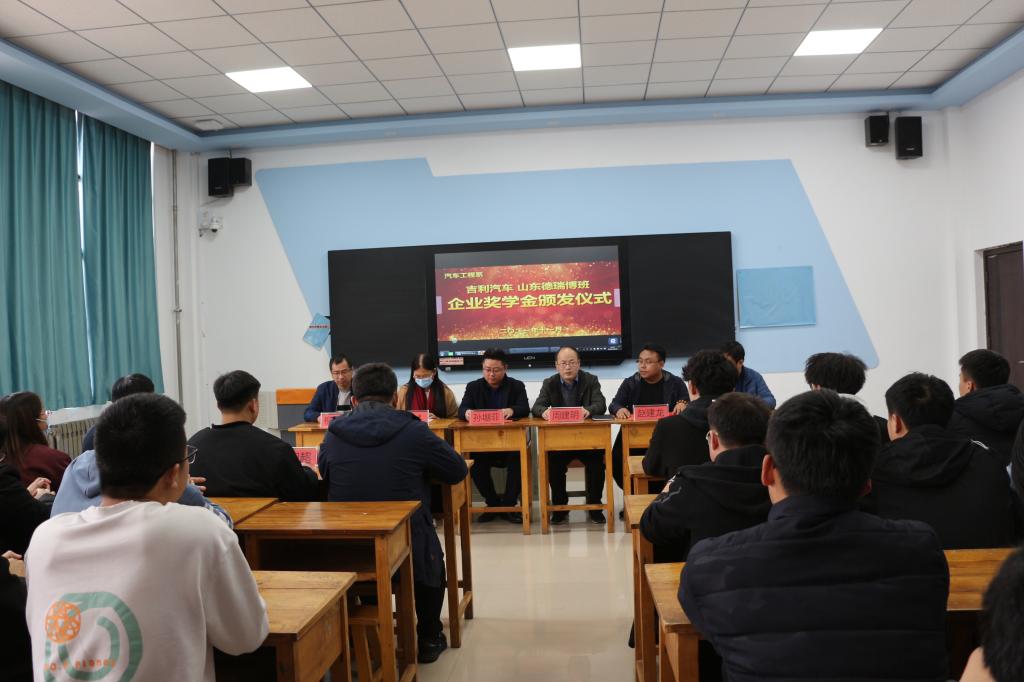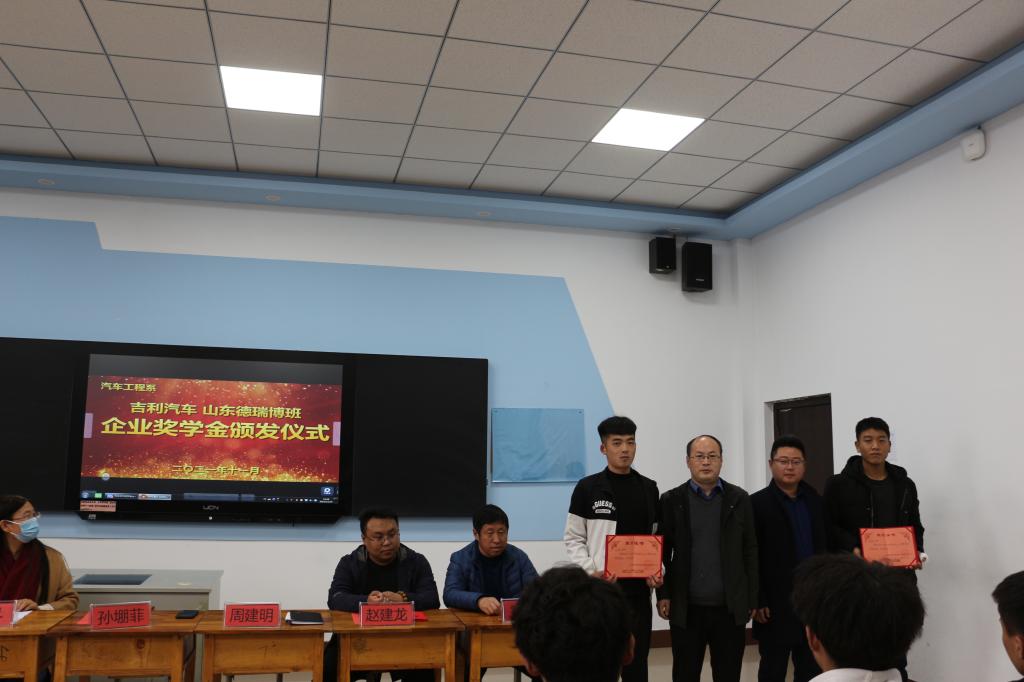 11月19日下午,汽车工程系隆重举行了“吉利.德瑞博汽车企业奖学金“颁发仪式,山东德瑞博新能源汽车制造有限公司校企合作部主任孙堋菲、市场总监赵建龙、技术总监柳振中,汽车工程系负责同志、教师代表以及全体山东德瑞博校企合作专业学生参加了颁奖活动,2020级校企合作专业的10名同学喜获首届学金。