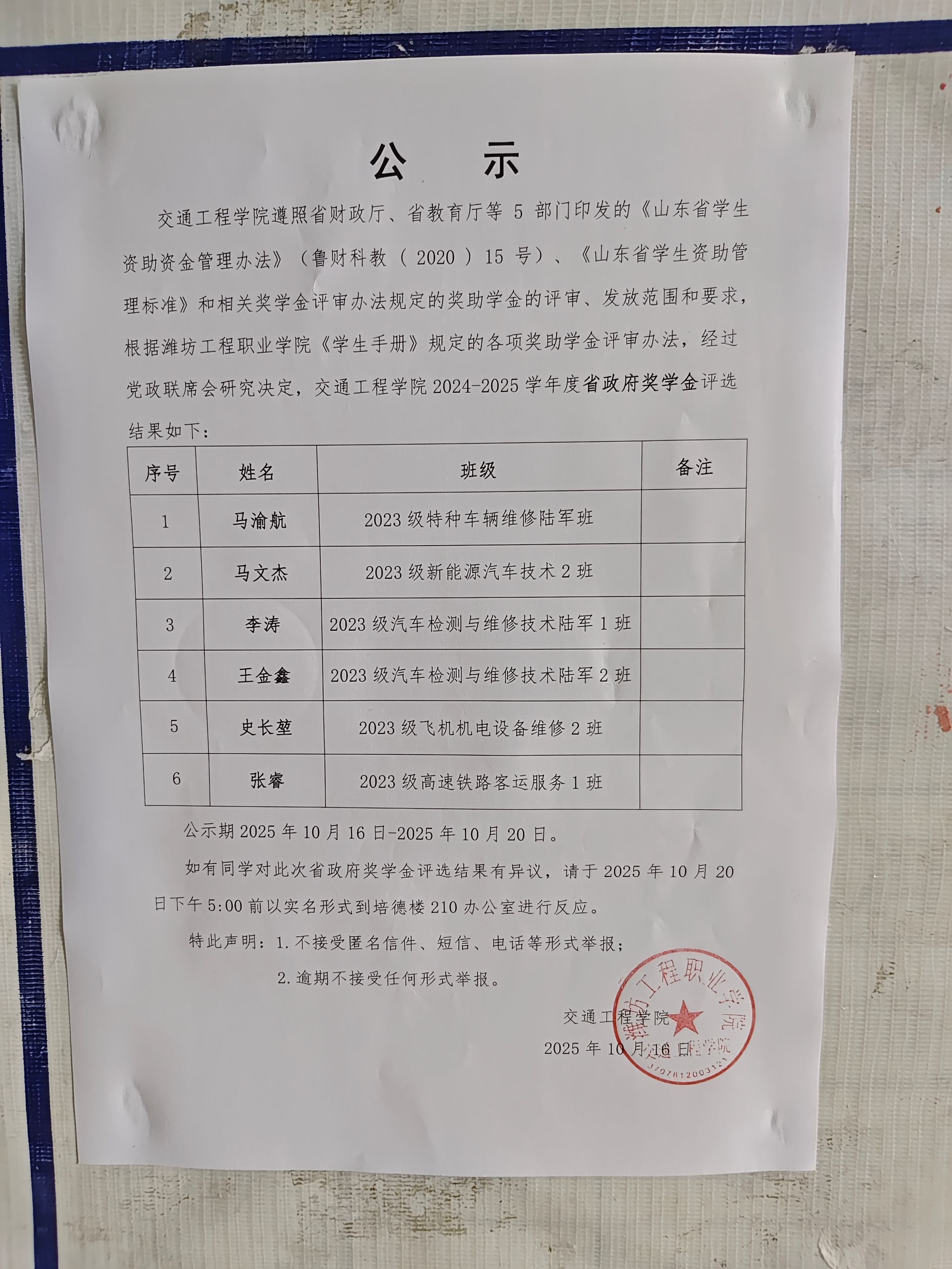 交通工程学院遵照省财政厅、省教育厅等 5 部门印发的《山东省学生资助资金管理办法》(鲁财科教 ( 2020 ) 15 号)、《山东省学生资助管理标准》和相关奖学金评审办法规定的奖助学金的评审、发放范围和要求,根据潍坊工程职业学院《学生手册》规定的各项奖助学金评审办法,经过党政联席会研究决定,交通工程学院2024-2025学年度省政府奖学金评选结果如下:
